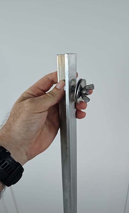 Verwenden Sie Erdungsstangen aus L-förmigen Aluminiumprofilen. Diese sind besser als kupferummantelte Stahlstangen, weil sie nicht korrodieren und leichter sind. Eine angeschliffene Spitze hilft, kleine Steine beim Einschlagen beiseite zu drücken.