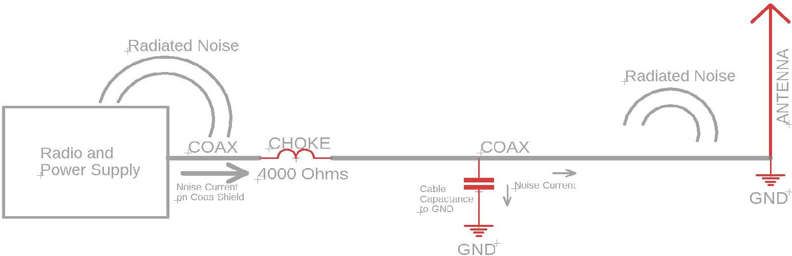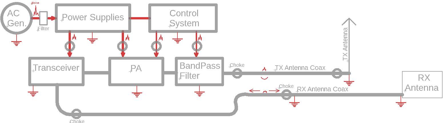 Neben dem Inverter-Generator sind Schaltnetzteile die Hauptquellen von Rauschen. Deren Störungen werden durch andere Geräte mit Mikroprozessoren noch verstärkt. Rauschen, das auf der Außenseite des Koaxmantels der Hauptantenne als Gleichtaktstrom geführt wird, kann in die Antenne einkoppeln; diese strahlt es dann ab. Die RX-Antenne in der Nähe kann dieses re-strahlte Rauschen wiederum aufnehmen. Ein in die Generatorausgänge eingefügtes Filter sowie Drosseln auf Netz-, Steuer- und Koaxleitungen, kombiniert mit sorgfältiger Erdung, reduzieren die in den Empfänger gelangenden Störungen erheblich.