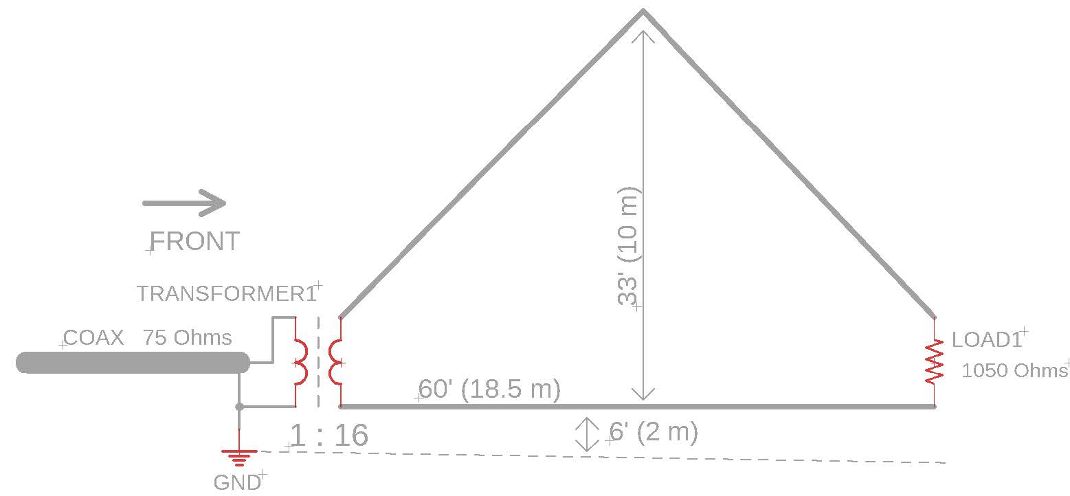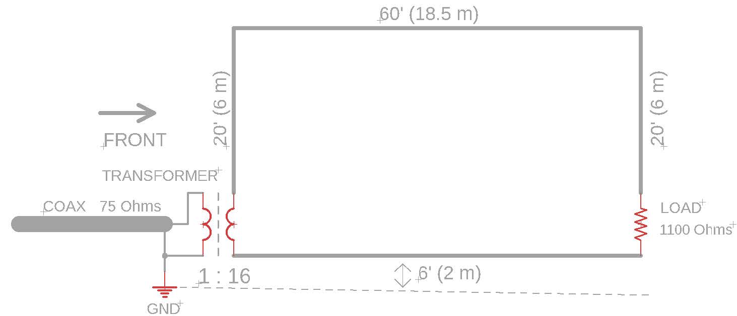 Es gibt einige wichtige Aspekte bei der Flag (und anderen Schleifen): Erstens sind die Abmessungen nicht kritisch, ebenso wenig das genaue Übersetzungsverhältnis des Übertragers oder der Wert des Abschlusswiderstands. Ein 1:9-Übertrager funktioniert ebenfalls, und der Abschlusswiderstand kann irgendwo zwischen 900 und 1.200 Ohm liegen, solange Sie keine extrem scharfe Null nach hinten brauchen. Die hier angegebenen Werte sind diejenigen, die ich verwende und durchgerechnet habe. Man kann die Antenne um drei Meter kürzen, ohne dass sich viel ändert. Machen Sie sie aber nicht zu klein, sonst funktioniert sie nicht mehr! Die Signalspannung der Schleife ist proportional zur umschlossenen Fläche. Wird die Antenne zu klein (Gewinn -50 dBi oder schlechter), ist das empfangene Signal so niedrig, dass es nahe am thermischen Rauschen des Abschlusswiderstands liegt. S9-Signale hört man noch, aber schwächere Signale werden vom Widerstandsrauschen überdeckt. Ein Vorverstärker kann das nicht mehr „reparieren“.