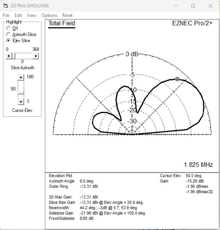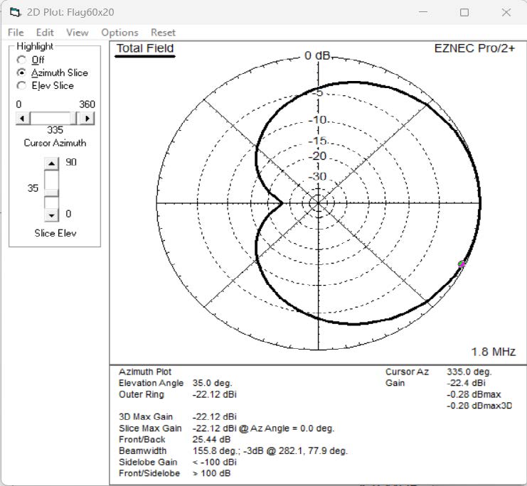 Die oben gezeigte Flag hat aufgrund ihrer Größe einen Gewinn von -22 dBi. Eine kleinere Version hätte geringeren Gewinn, dafür leicht bessere Vor-/Rückdämpfung und einen etwas höheren DF. Außerdem ist die ursprüngliche Größe auf 80 m weniger nützlich. Wenn Sie die 160-m-Performance maximieren wollen, ist diese größere Antenne mit höherem Ausgangssignal besser. Ist Ihnen 80 m sehr wichtig, könnte eine 40×14-Fuß-Variante sinnvoller sein.