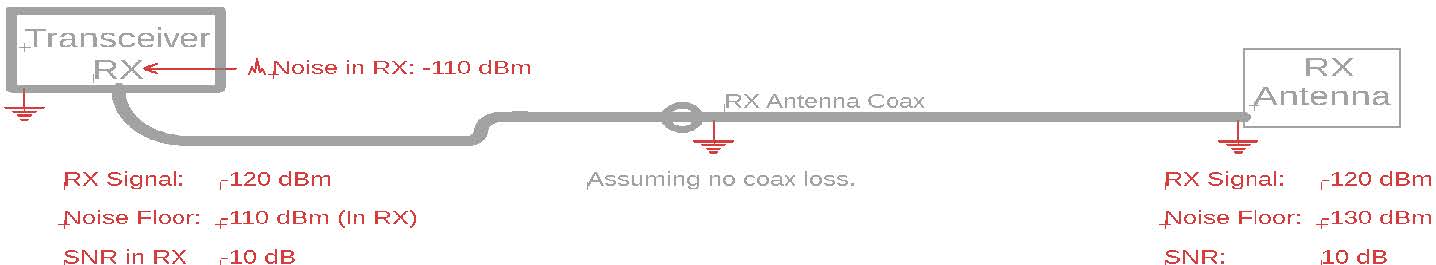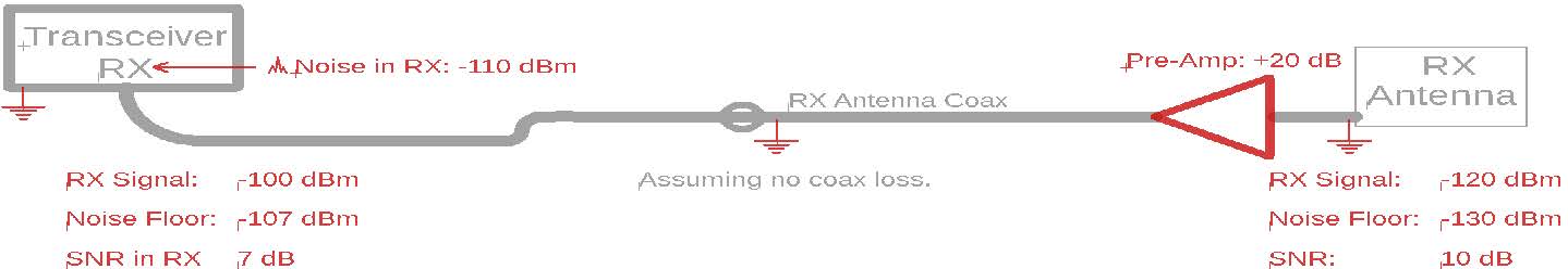 Ohne Vorverstärker wird das -120-dBm-Signal vom -110-dBm-Rauschen im Empfänger vollständig überdeckt (Sie verwenden eine RX-Antenne mit deutlich geringerem Ausgangspegel als die TX-Antenne). Der Vorverstärker hebt das Signal um 20 dB an, wodurch ein Abstand von 7 dB entsteht. (Er hebt auch das Hintergrundrauschen um 20 dB auf -110 dBm an. Der Gesamtstörpegel am Empfänger liegt dann bei etwa -107 dBm – tatsächlich etwas darunter, aber ich bin zu faul für die exakte Rechnung.)